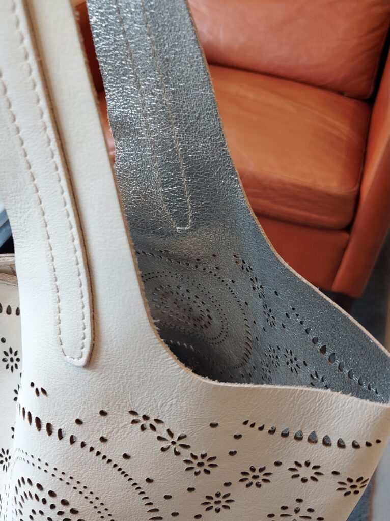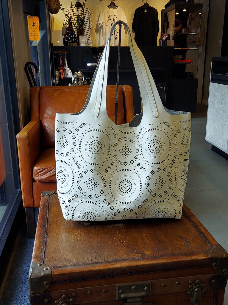 牛革にレーザーカットを施したトートバッグ。革の両面が表(ギン面)の綺麗で珍しい素材です。