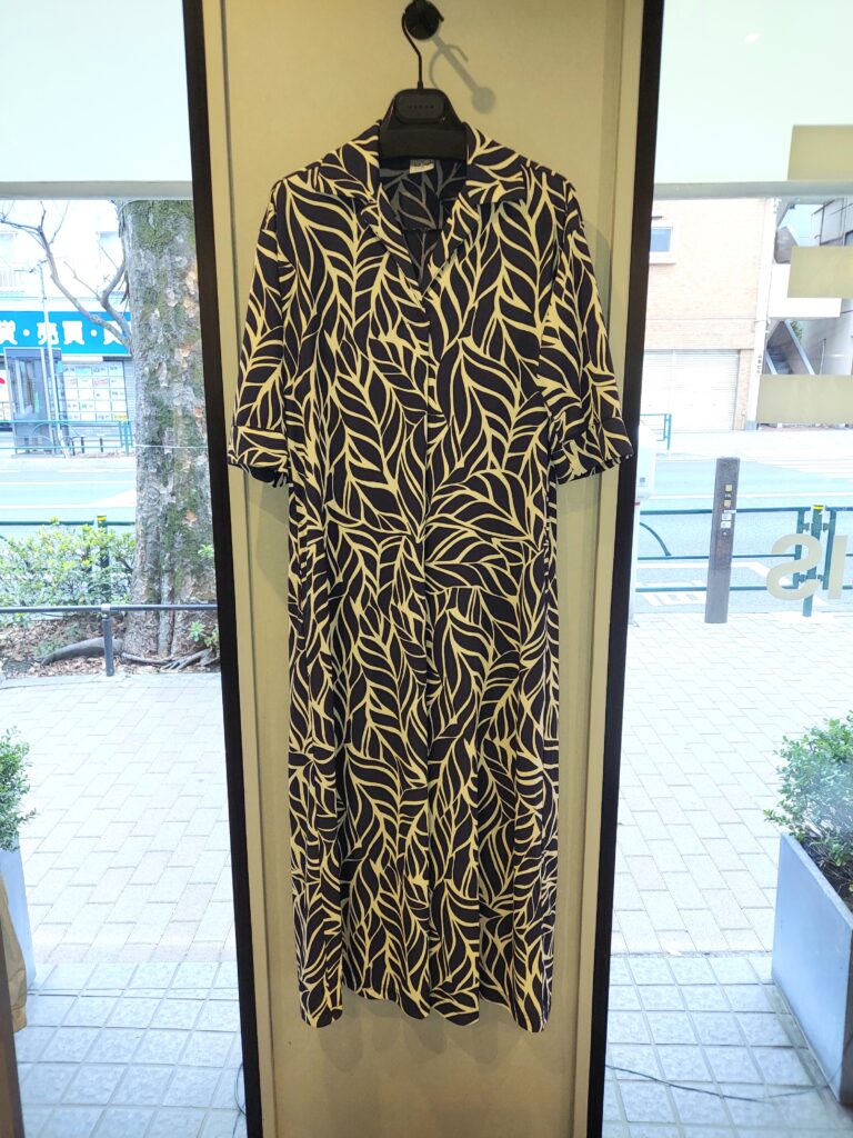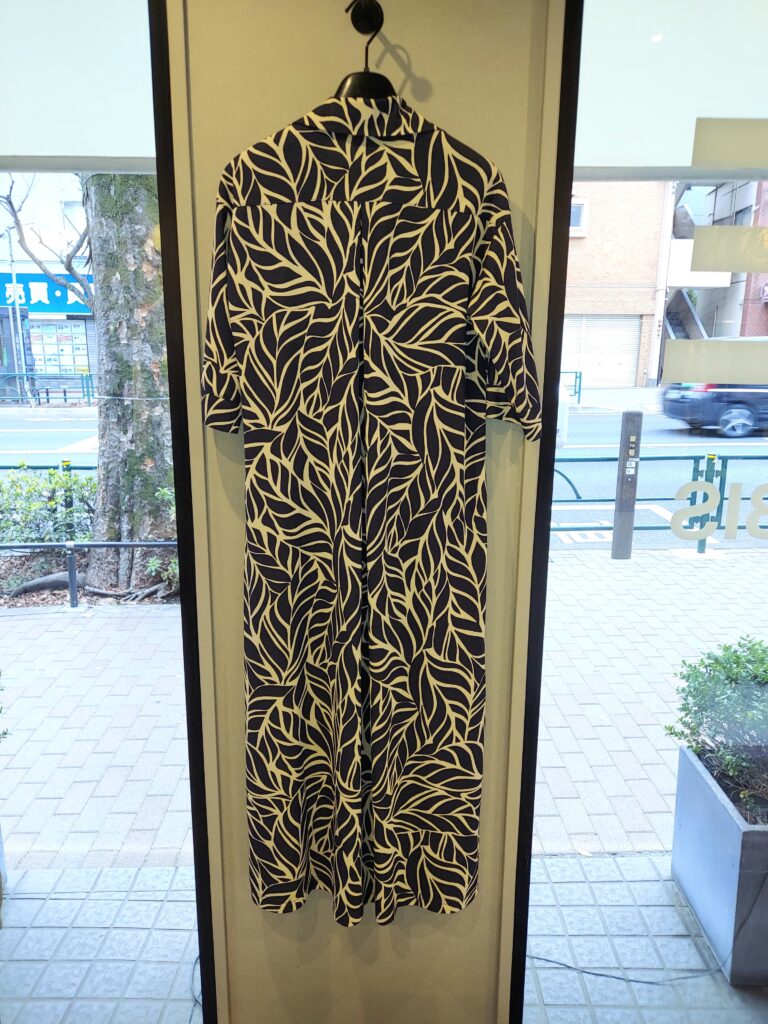 胸元や背中のタックからの緩やかに広がるシルエットにサラッとした生地のリーフ(葉)柄で動きのあるデザインになっています。