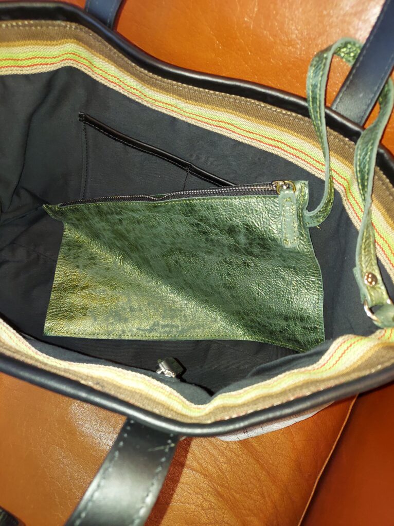 内側はファスナーと縫い付けのポケット、リード付きのミニポーチが1つございます。