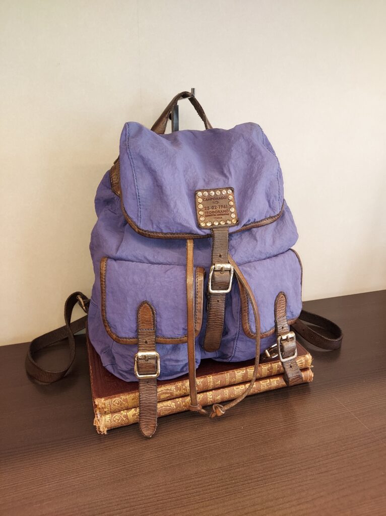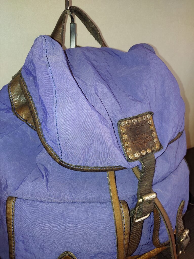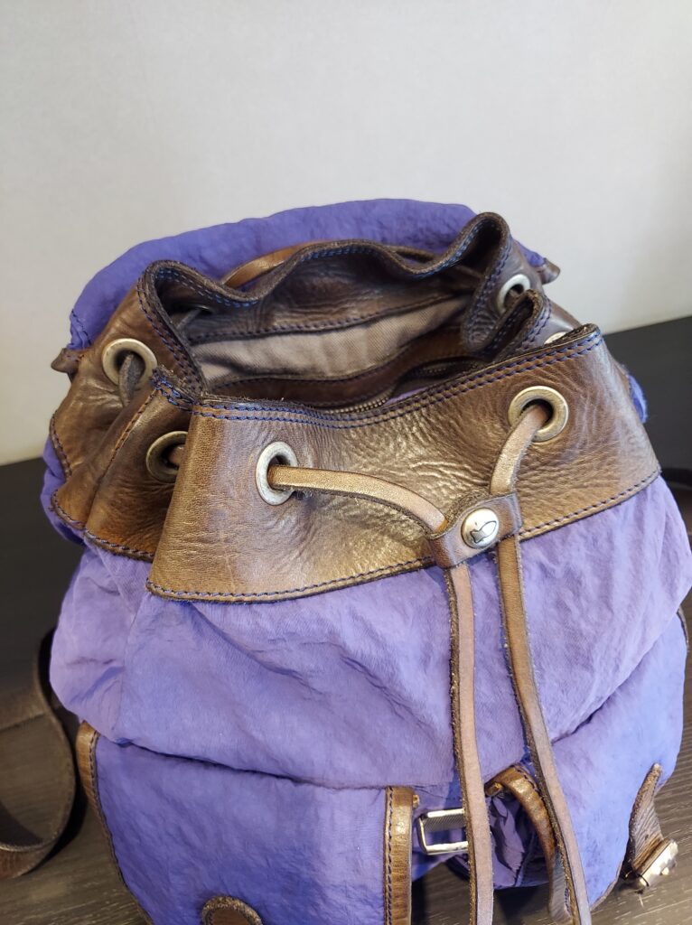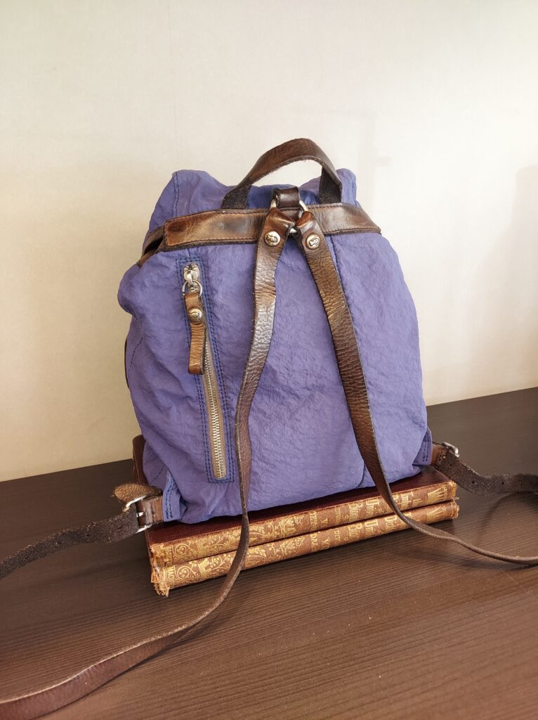 コロンと可愛いミニリュック。シルキーなナイロンを敢えてシワ加工して、要所にレザーを使うことで上質なカジュアル感を醸します。