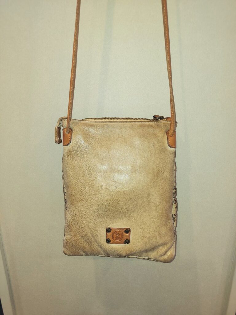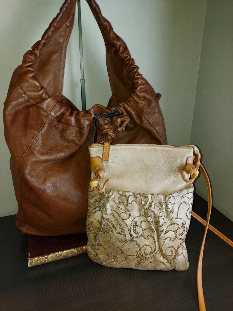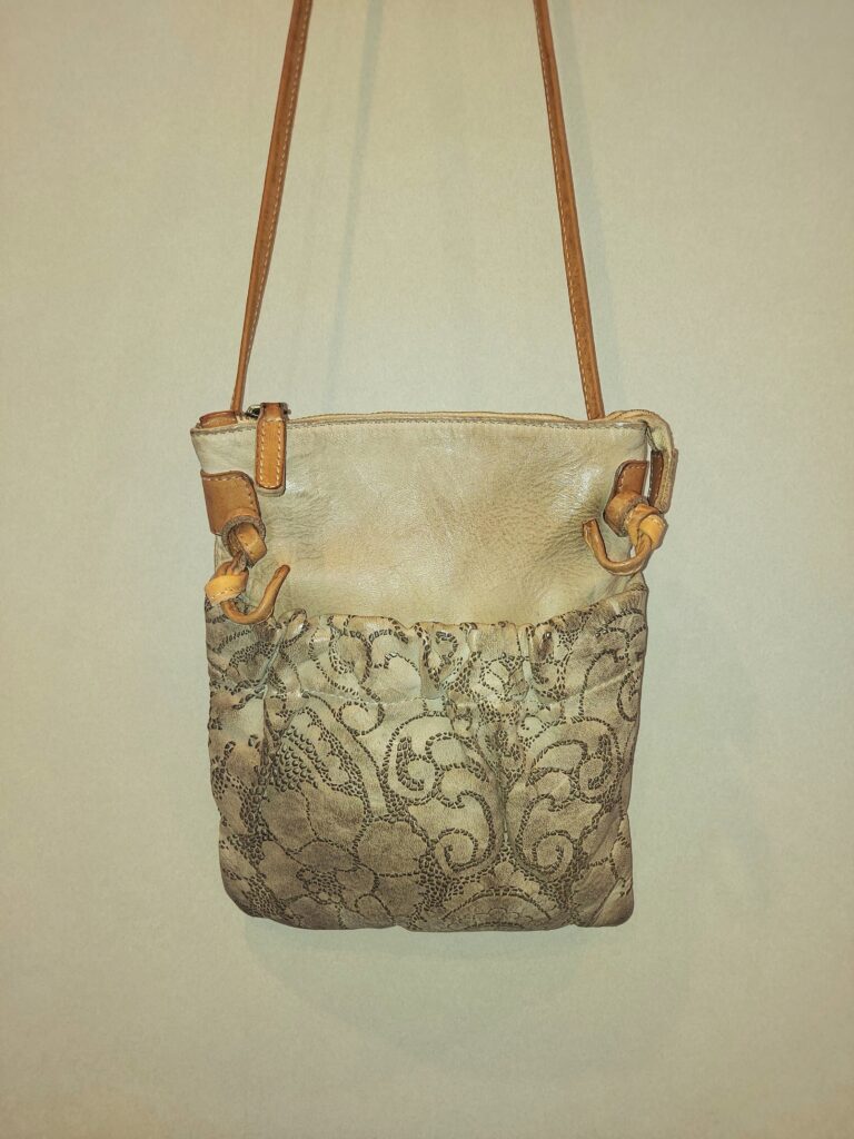 レース風のレーザーカットが目を引くレザーポシェット。製品染めによるヴィンテージ感が他にはない雰囲気を醸しています。