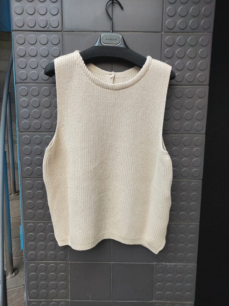 New Arrival前後両方で着られるコットン・ジレ。ゆとりがありつつ大きく見せないバランスが秀逸です。シンプル&ベーシックで様々なコーデに着回せるオススメの1着です。