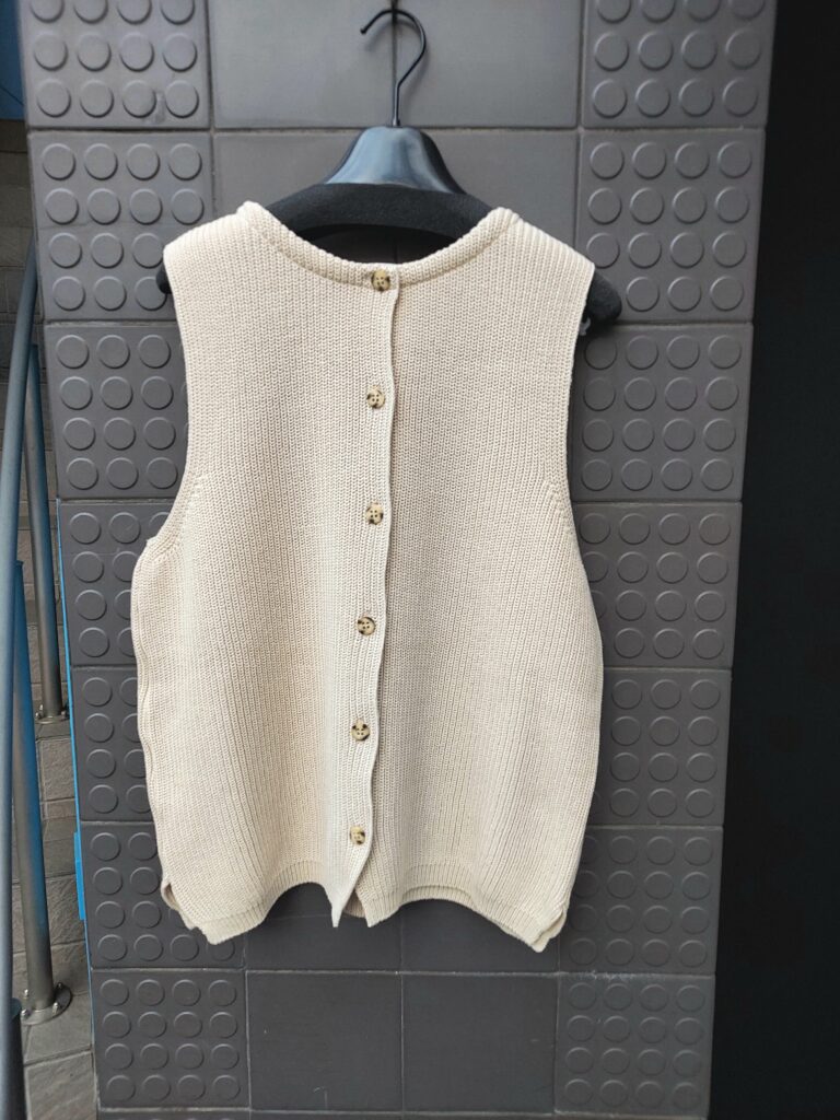 前後両方で着られるコットン・ジレ。ゆとりがありつつ大きく見せないバランスが秀逸です。シンプル&ベーシックで様々なコーデに着回せるオススメの1着です。