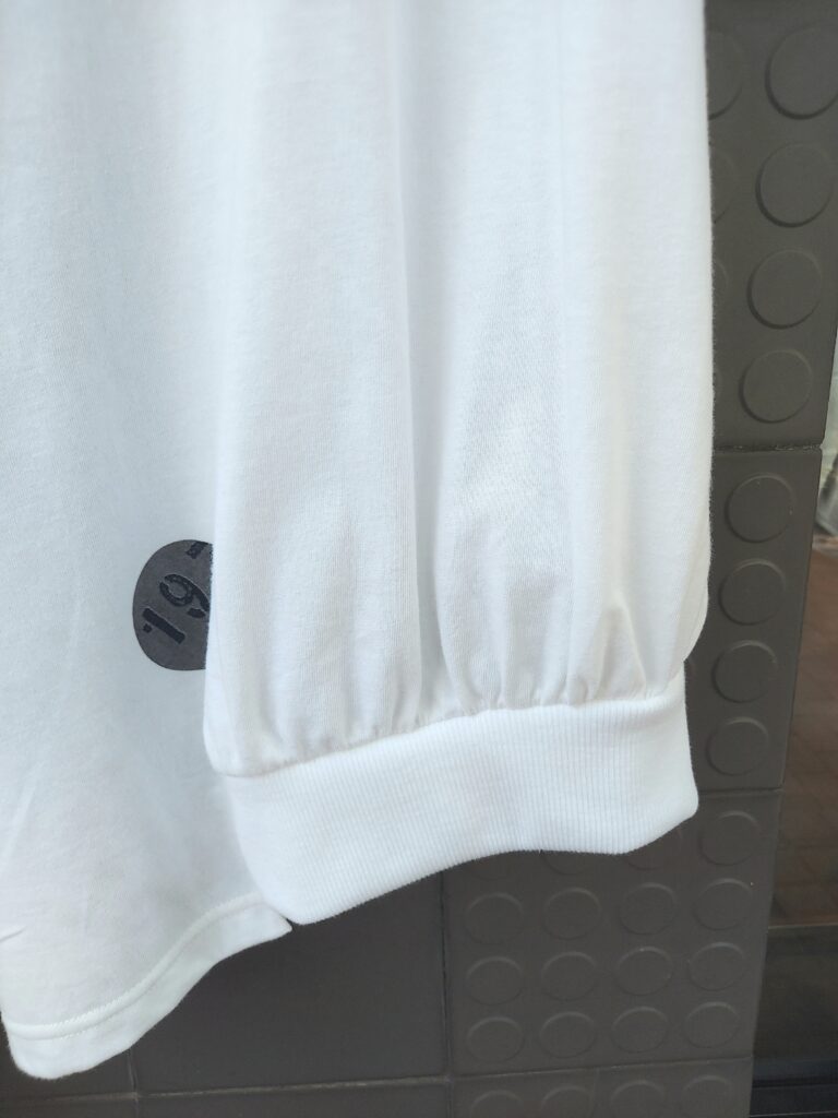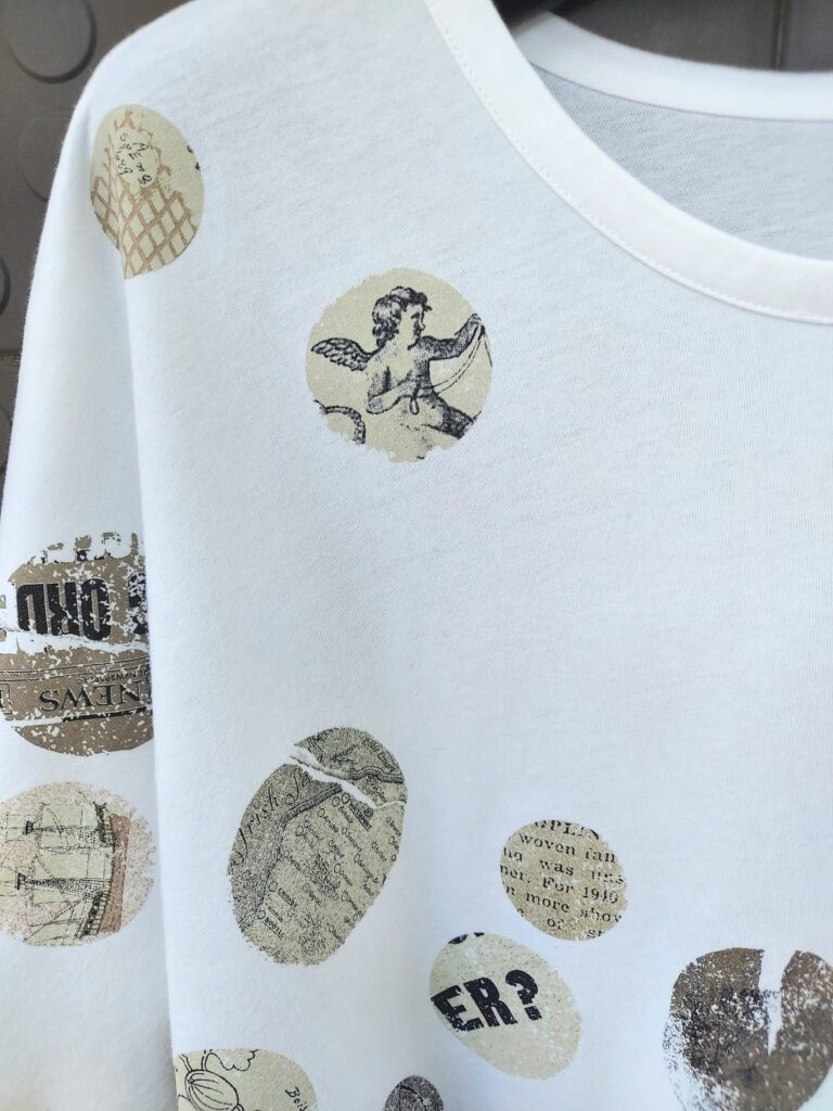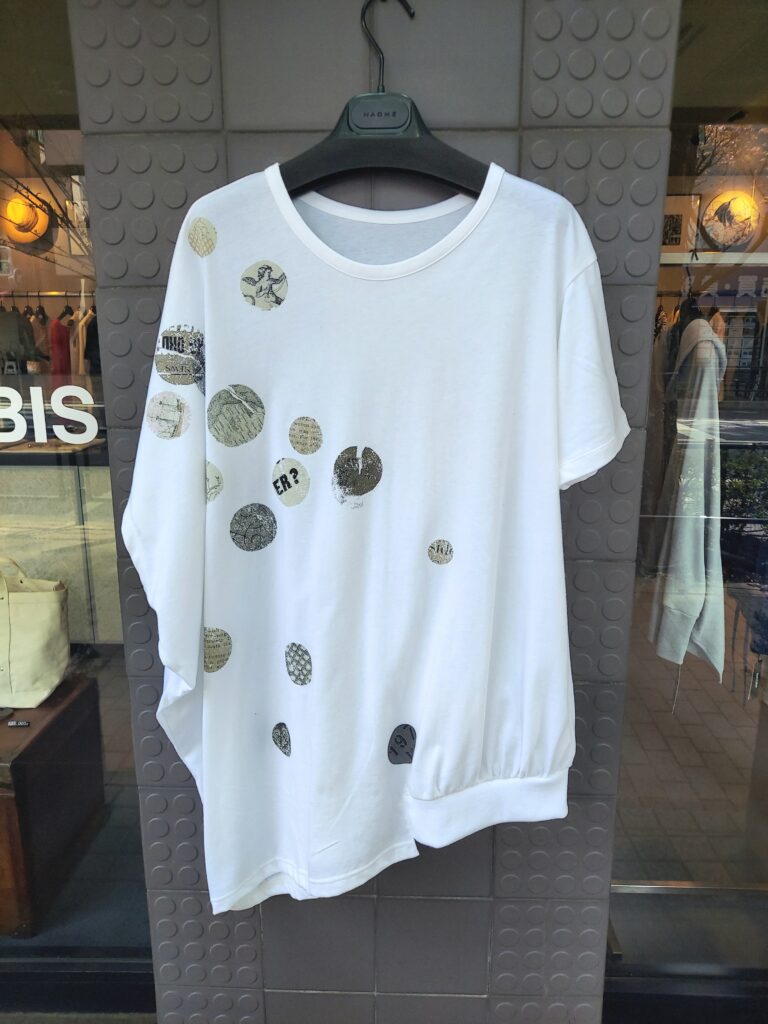 新聞紙や天使のモチーフをドット柄にプリントしたカットソー。上質なコットンによるドレープがアシンメトリーなデザインを違和感なく演出しています。