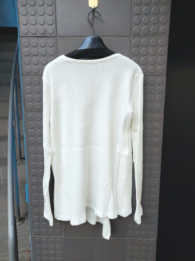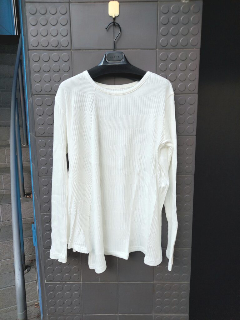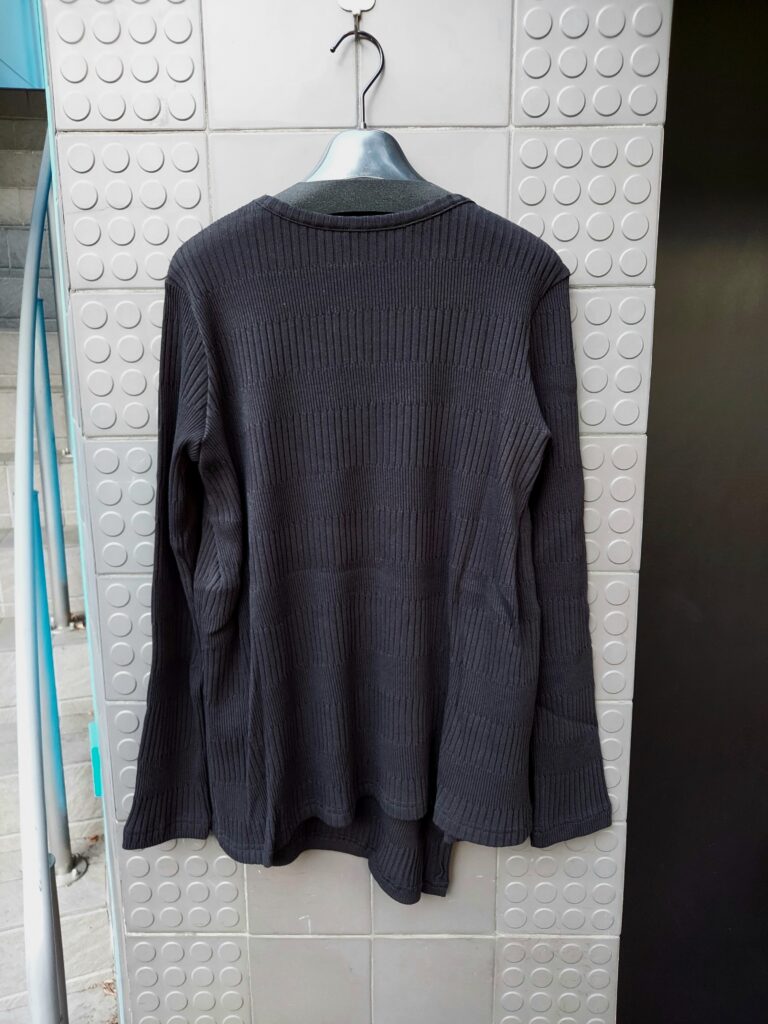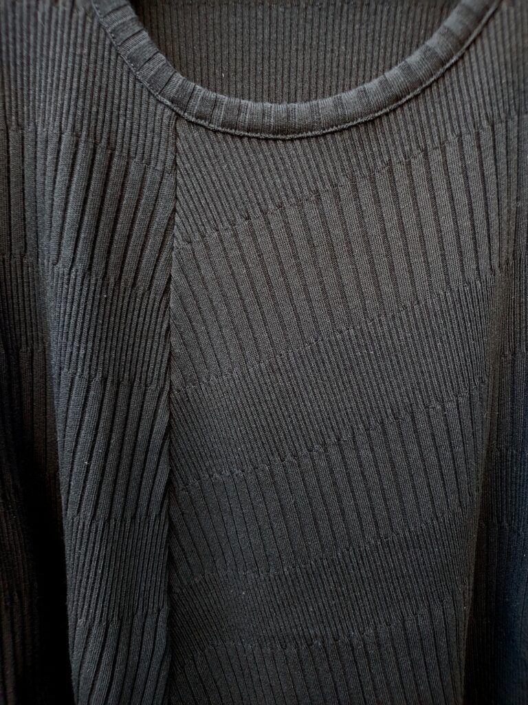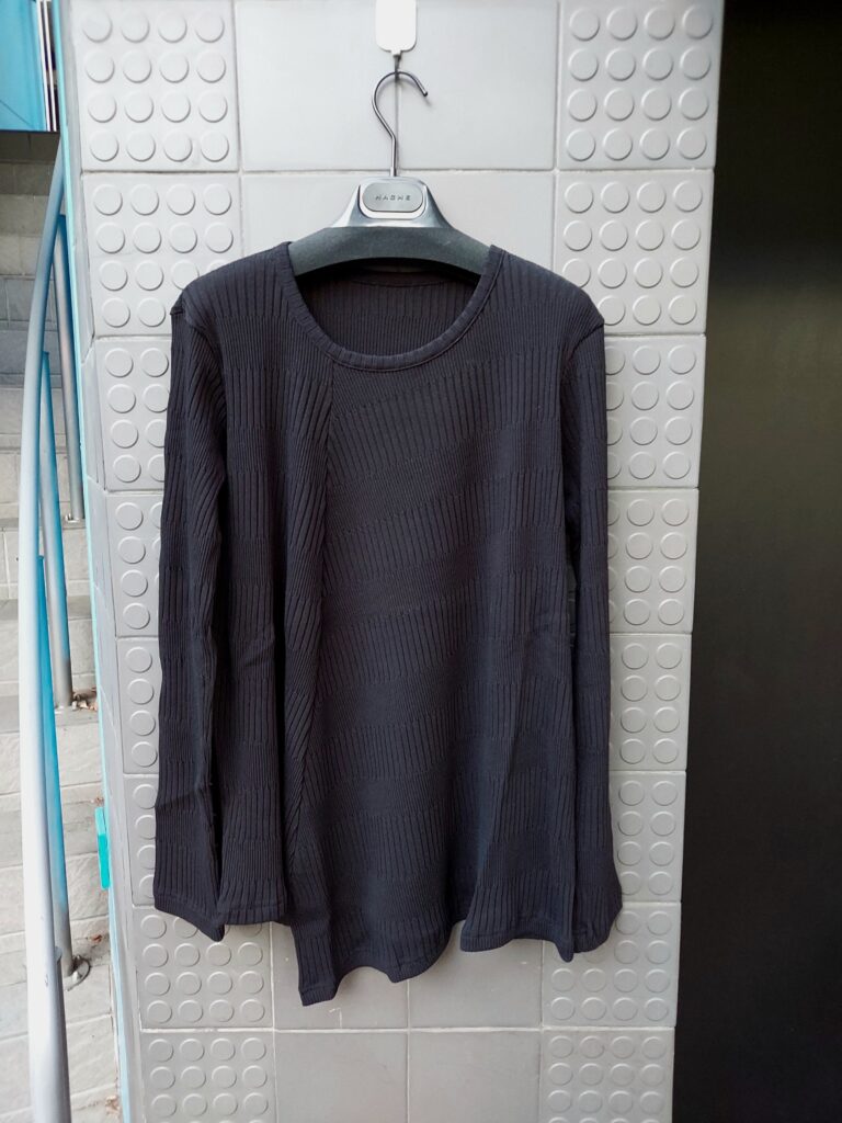 ランダムにボーダーが入ったフレア・カットソー。前に切り替えを入れてボーダー柄をずらし、裾をアシンメトリーにするなどY’sらしいデザインに。ざっくり身頃とスッキリ袖のバランスが絶妙な着やすい1着です。