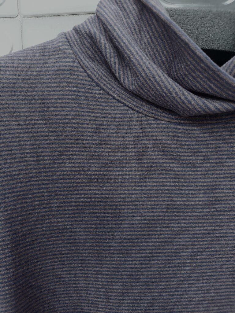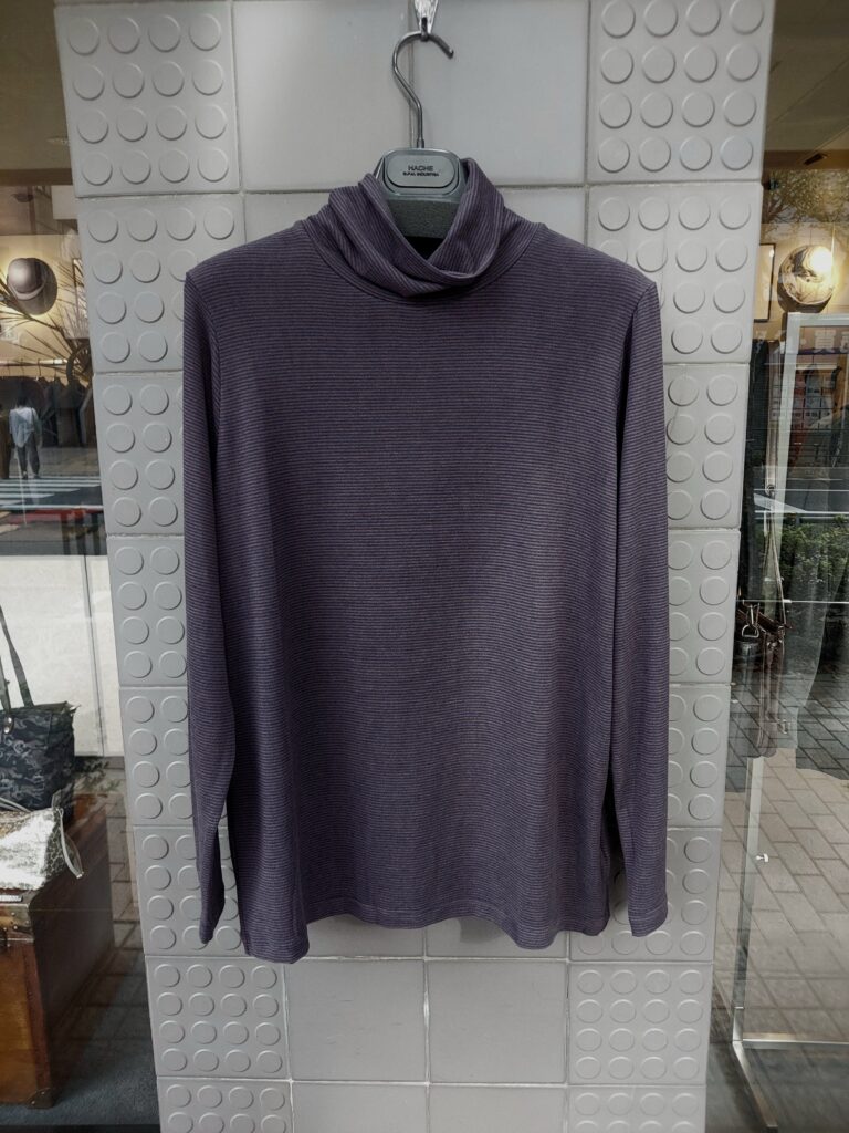 悪目立ちしない細いボーダーのハイネック・カットソー。微かに起毛した表面はスエードのような手触り、内側はレーヨンの滑らかさです。