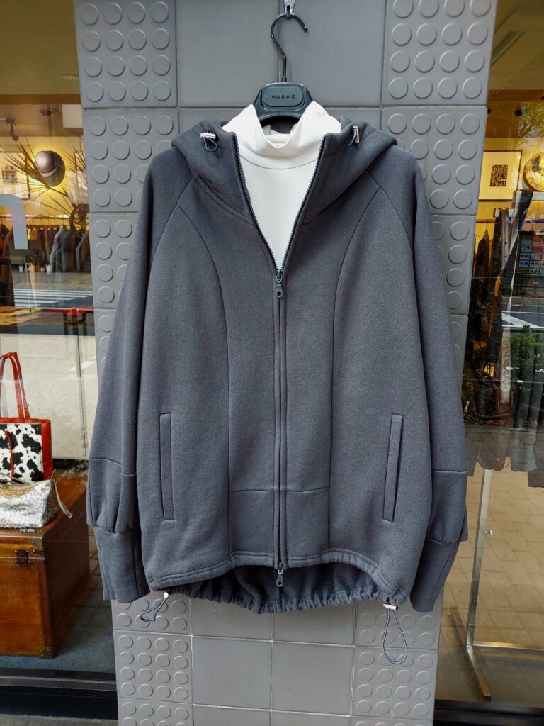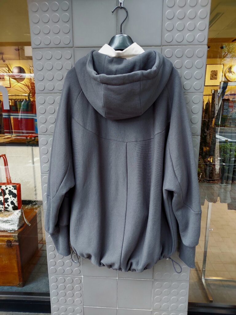 微かな裏起毛が心地好いコットンパーカー。襟回りからフードにかけては生地を二重にして質感と保温性を引き上げています。