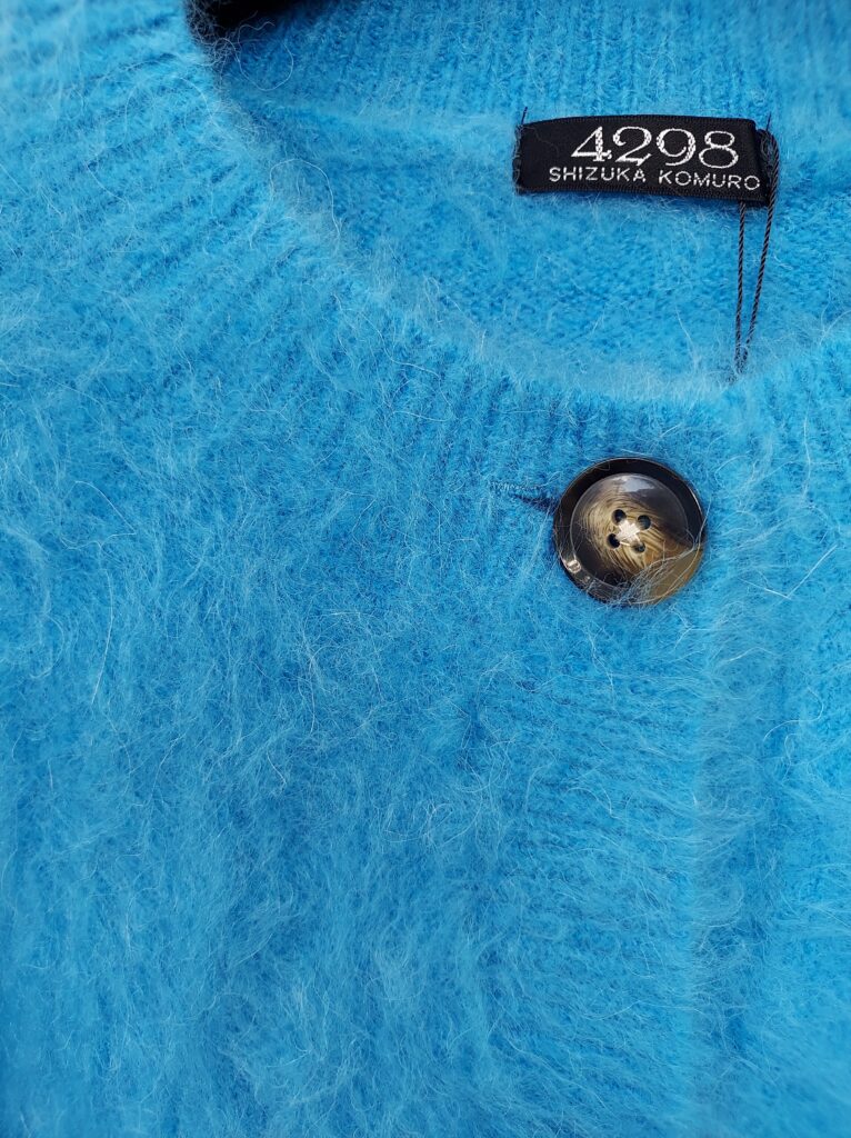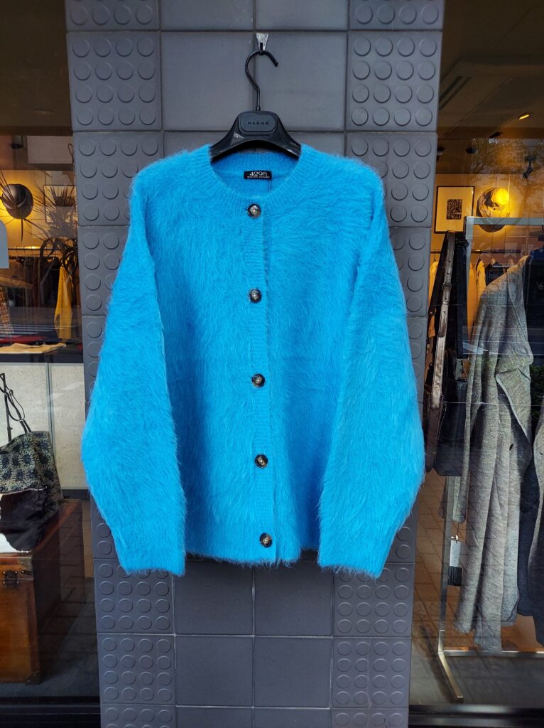 やや短い毛足のシンプル・カーディガンが入荷しました。ソフトなストレッチとドロップショルダーで着やすい1着です。