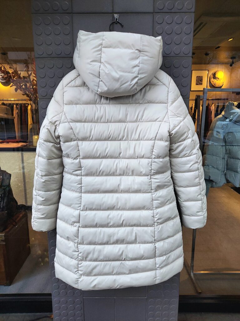膝にかかる丈感のダウンコート。切り替えでシェイプしつつ裾へ広がる綺麗なシルエットご魅力です。中綿には軽い機能性素材を使い、立ち襟な袖口のゴムで保温性◎