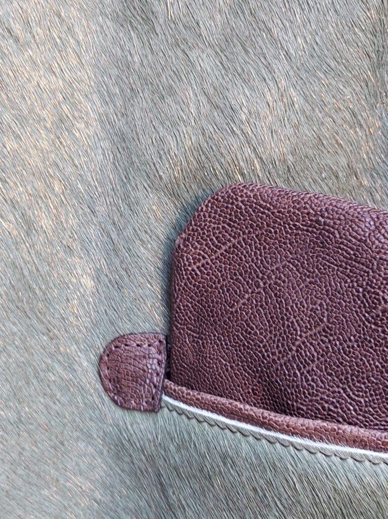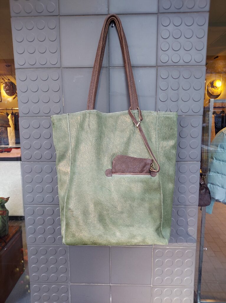 微かな光沢と天然のグラデーションが目を引く、しっとりした手触りのハラコ・トート。