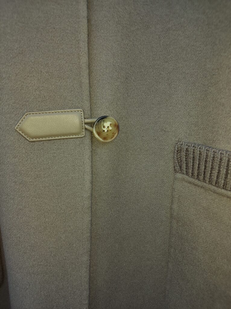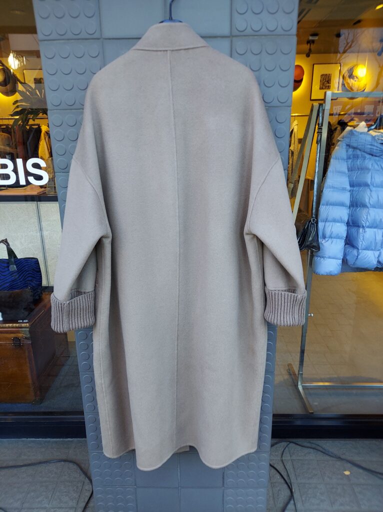 優しく綺麗な色のウールコート。ドロップショルダーに袖口のリブなど着やすい現代のデザインに仕上げています。裏地なしでも暖かくて滑りが良いのは上質の証です。