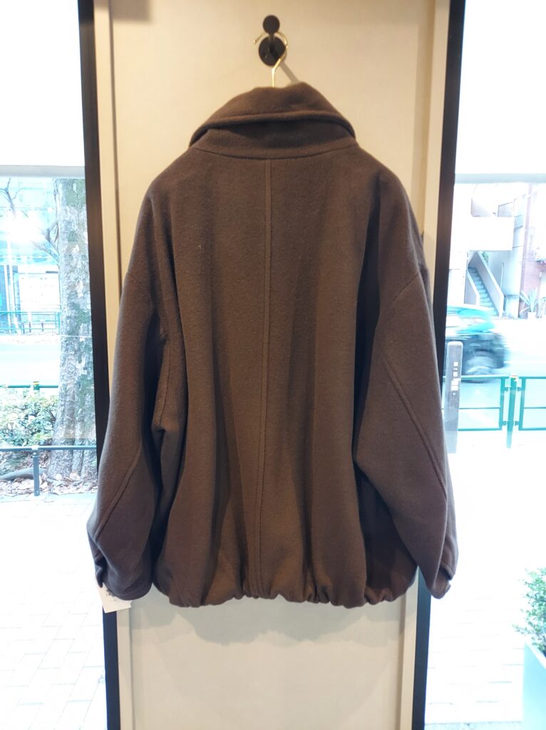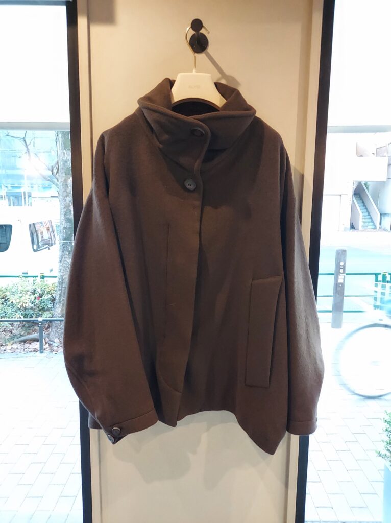 スタンドカラーにドロップショルダー、裾の広がりを抑えたシルエットでトレンドを取り入れつつスッキリしたデザインに仕上げています。